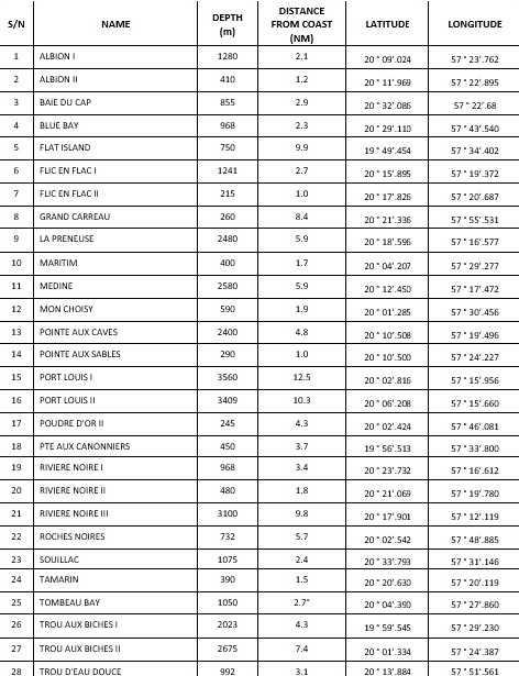 List of FADs with mooring depths, distance from the nearest coast and positions are detailed in the table below: